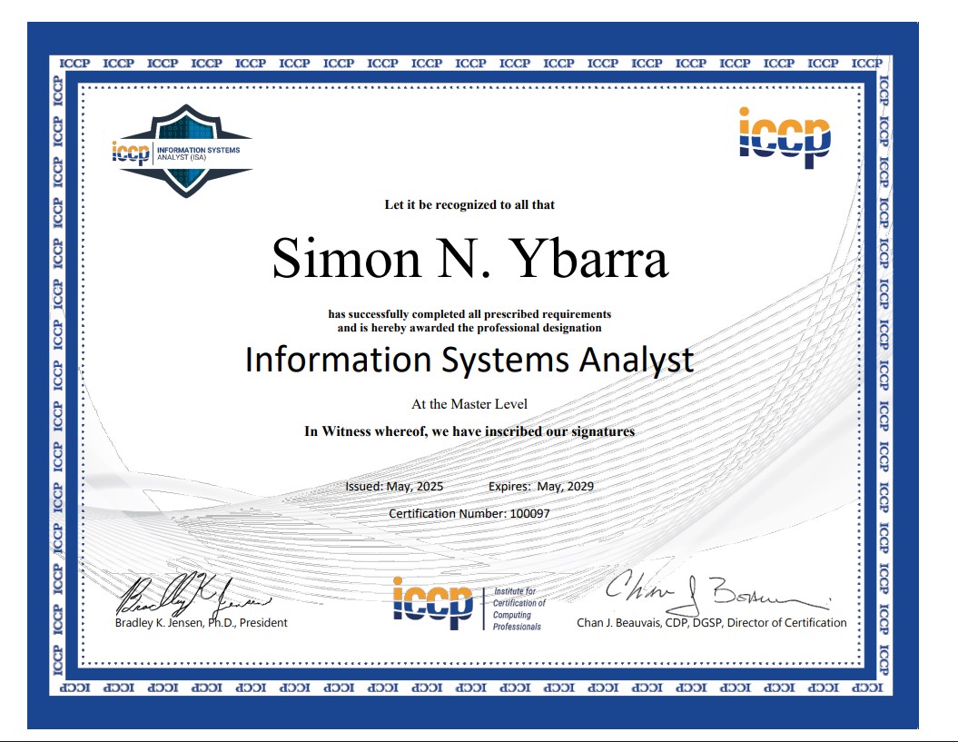 In addition to my academic credentials, I have received professional certifications from the Institute for Certification of Computing Professionals (Information Systems Analyst) and CompTIA (A+). ISA A+